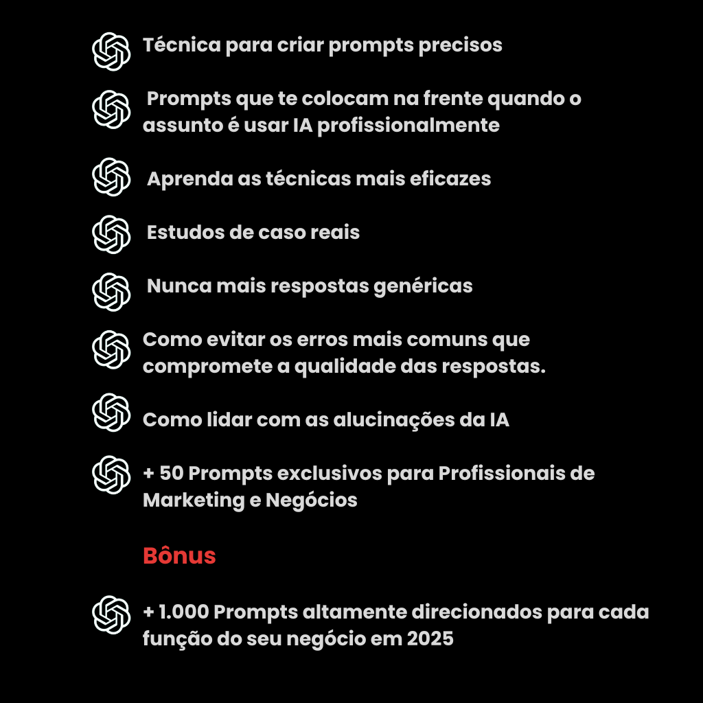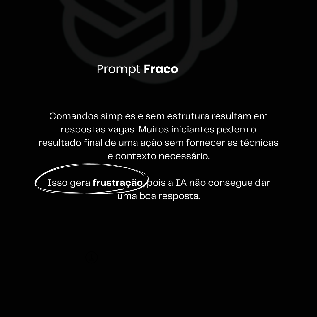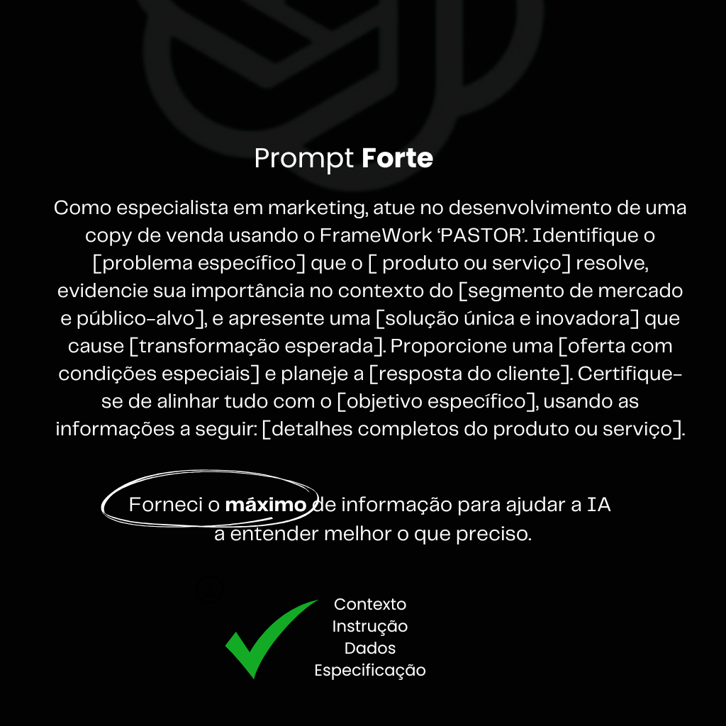 Cada comando tem uma lógica e se você aprender a usar para o seu trabalho, vai conseguir usar a IA a seu favor com maestria. Não é sobre te entregar estratégia pronta, é sobre te ensinar a dominar a arte dos prompts de forma eficiente e para resultados muito melhores.